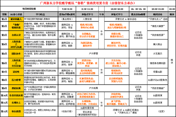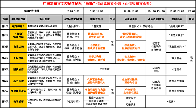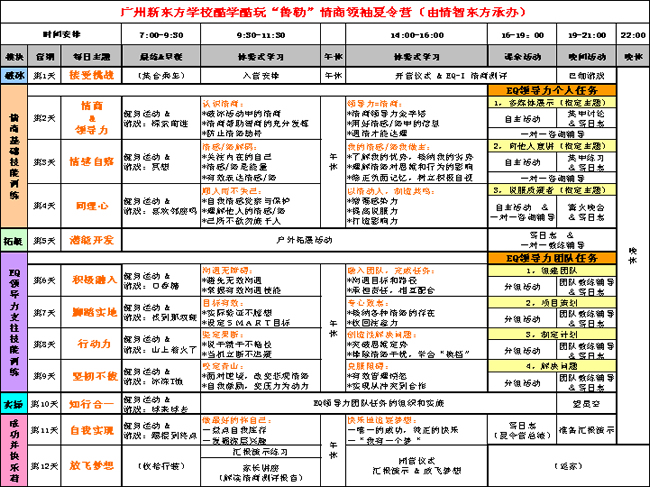情商“素質(zhì)”營:2011.7.16-23 (8天) 情商“優(yōu)培”營:第一期:2011.7.24-8.4 (12天)、 第二期:2011.8.6-17 (12天) 情商“領(lǐng)袖”營:第一期:2011.7.24-8.4 (12天)、 第二期:2011.8.6-17 (12天) |