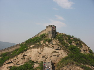 五月的北京天氣非常不錯(cuò)。晴朗但不炎熱。藍(lán)天白云下,群山起伏,深色的長城匍匐在青山之顛,連綿不絕。待在城里久了,腿腳早就躍躍欲試,踏上長城便有向上奔跑的沖動(dòng),仿佛我就是那古時(shí)守城的戰(zhàn)士。對(duì)于從小山里長大的我來說,八達(dá)嶺的坡度實(shí)在算不上什么,何況長城上是那么的平坦寬敞。只是中間有一段確實(shí)比較陡峭些罷了。爬到海拔868的好漢坡,迎著山風(fēng)站立,撫摸城墻,用心感受著歷史的滄桑。不過癮的我下了北段長城,又向南段長城進(jìn)軍,這段長城有很長一段是貴州組織的書畫義賣捐款修復(fù)的,呵呵,記事碑上我還發(fā)現(xiàn)了我家鄉(xiāng)城市的名字。南段長城不如北段有名,但這段長城兩邊的松柏卻很是茂盛。我從長城上下去鉆到樹林里,找塊綠蔭地坐下品嘗自己炒的怪嚕飯,哈哈,就仿佛回到了家鄉(xiāng)。這段長城上游人就少了很多,你可以隨意的坐在城墻上,吹吹風(fēng),看看靚女,愜意愜意啊。景區(qū)最南端烽火臺(tái)的外面就是還未修復(fù)的殘長城了,可以翻過鐵絲網(wǎng)去觸摸真正的歷史??上?.1的時(shí)候有保安看守,只能在烽火臺(tái)上看看罷了。