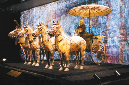 1980年底,在陜西臨潼出土了兩乘“秦陵彩繪銅車馬”。這兩件珍貴的秦代青銅器,如真車馬一半大小,因造型精妙絕倫、工藝高超復(fù)雜,被譽(yù)為“青銅之冠”。這次在中國(guó)館展出的為“一號(hào)銅車馬”。