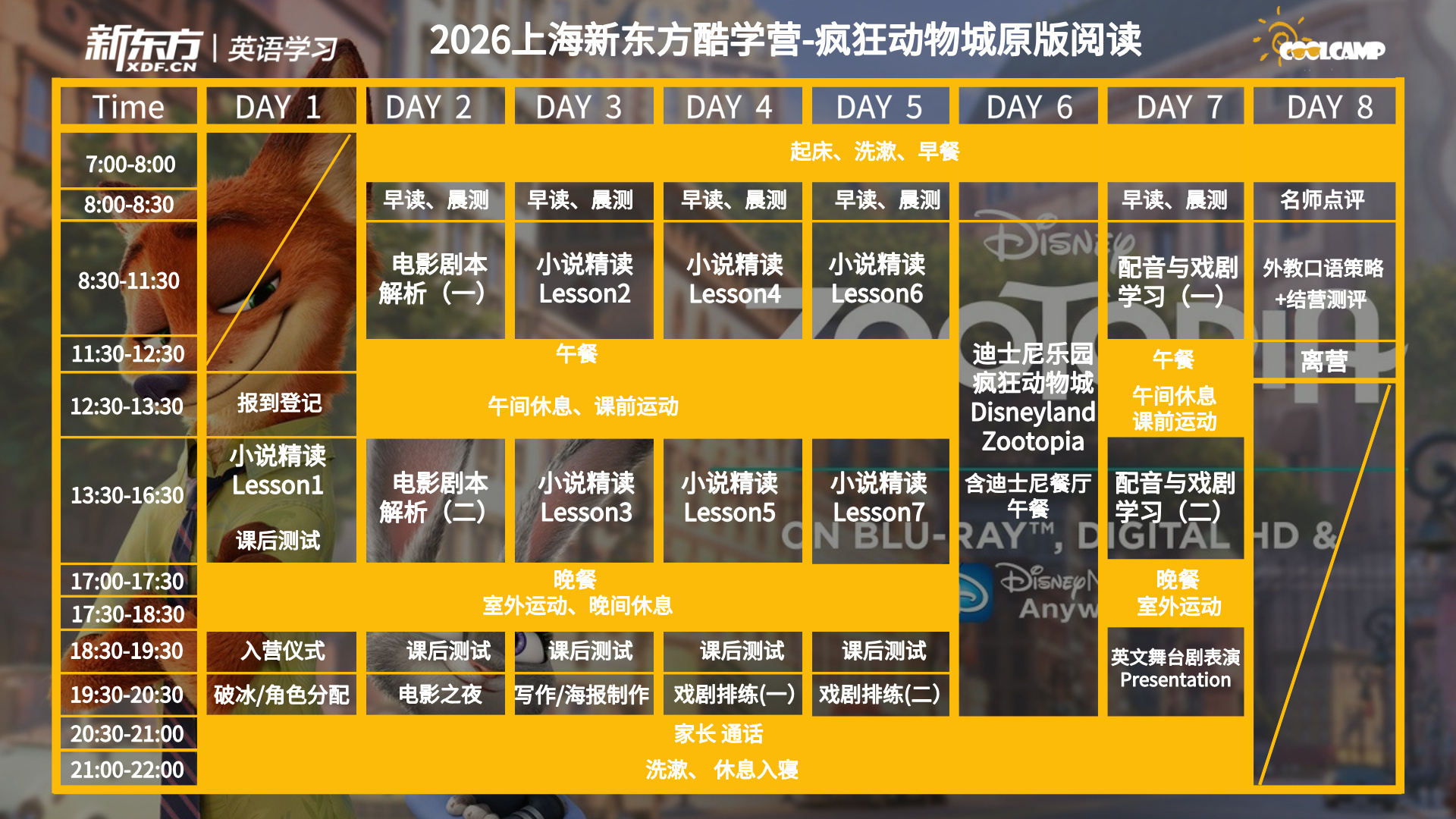 新東方酷學(xué)營(yíng)原版閱讀不僅僅是關(guān)于閱讀和理解原版小說(shuō)的過(guò)程,更是一次全方位的深度學(xué)習(xí)體驗(yàn)。我們將從小說(shuō)精讀、電影劇本解析,到配音與戲劇表演等多個(gè)角度,帶你深入探索《瘋狂動(dòng)物城》的精彩世界。