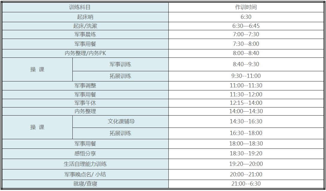 其特訓(xùn)營(yíng)中涵蓋多樣的特色課程如:軍事角色體驗(yàn),紀(jì)律與規(guī)則訓(xùn)練,禮節(jié)禮貌訓(xùn)練,軍人氣質(zhì)訓(xùn)練(站姿、走姿、坐姿、精氣神),軍事指揮訓(xùn)練,站崗執(zhí)勤,安全員,警棍盾牌術(shù),旗語(yǔ)指揮,科學(xué)實(shí)驗(yàn)課堂,國(guó)旗護(hù)衛(wèi)隊(duì),組織策劃能力訓(xùn)練,超級(jí)自信演講力訓(xùn)練。