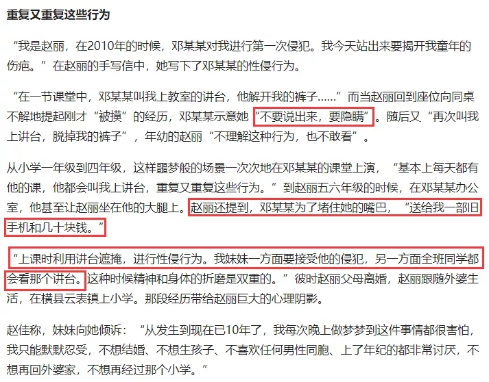 2020年3月20日,一名來(lái)自廣西橫縣的女孩趙麗“自揭傷疤”式的敘述在微博公布。趙麗說(shuō)從2010年剛上小學(xué)時(shí)起一直被數(shù)學(xué)老師鄧某某性侵,從小學(xué)一年級(jí)持續(xù)到了五六年級(jí)時(shí),鄧某某甚至在辦公室讓趙麗坐在他的大腿上,進(jìn)行侵犯。