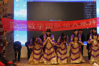 泡泡少兒數(shù)學(xué)團隊的俊男美女們用悠揚的《梔子花開》作為開場舞,華麗的服飾和優(yōu)雅的舞姿將年會氣氛烘托得溫馨浪漫,跳到一半背景音樂突然轉(zhuǎn)變?yōu)榛顫姛狒[的《窮開心》,又頓時讓年會的熱度頓時直線上升。