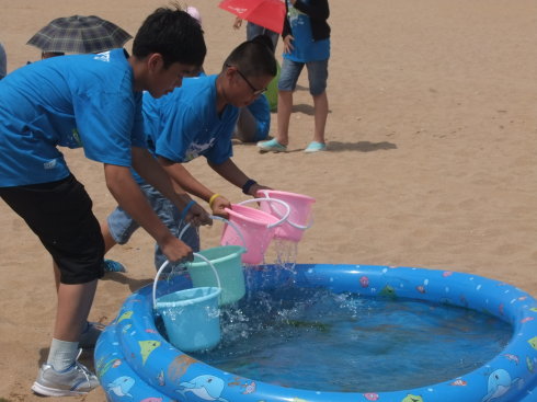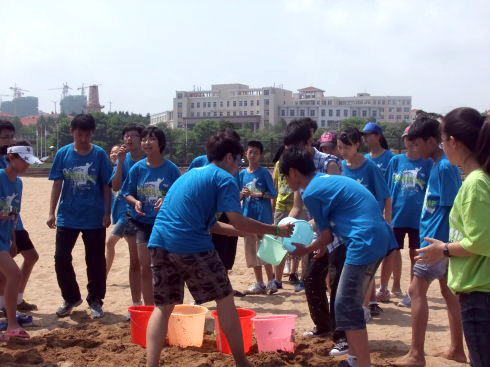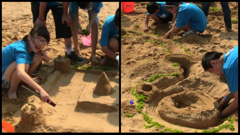 哇,我們的小營員都那么專業(yè),挖坑掘道,修了長城,砌了金字塔,還用綠色的海藻裝飾了城墻。